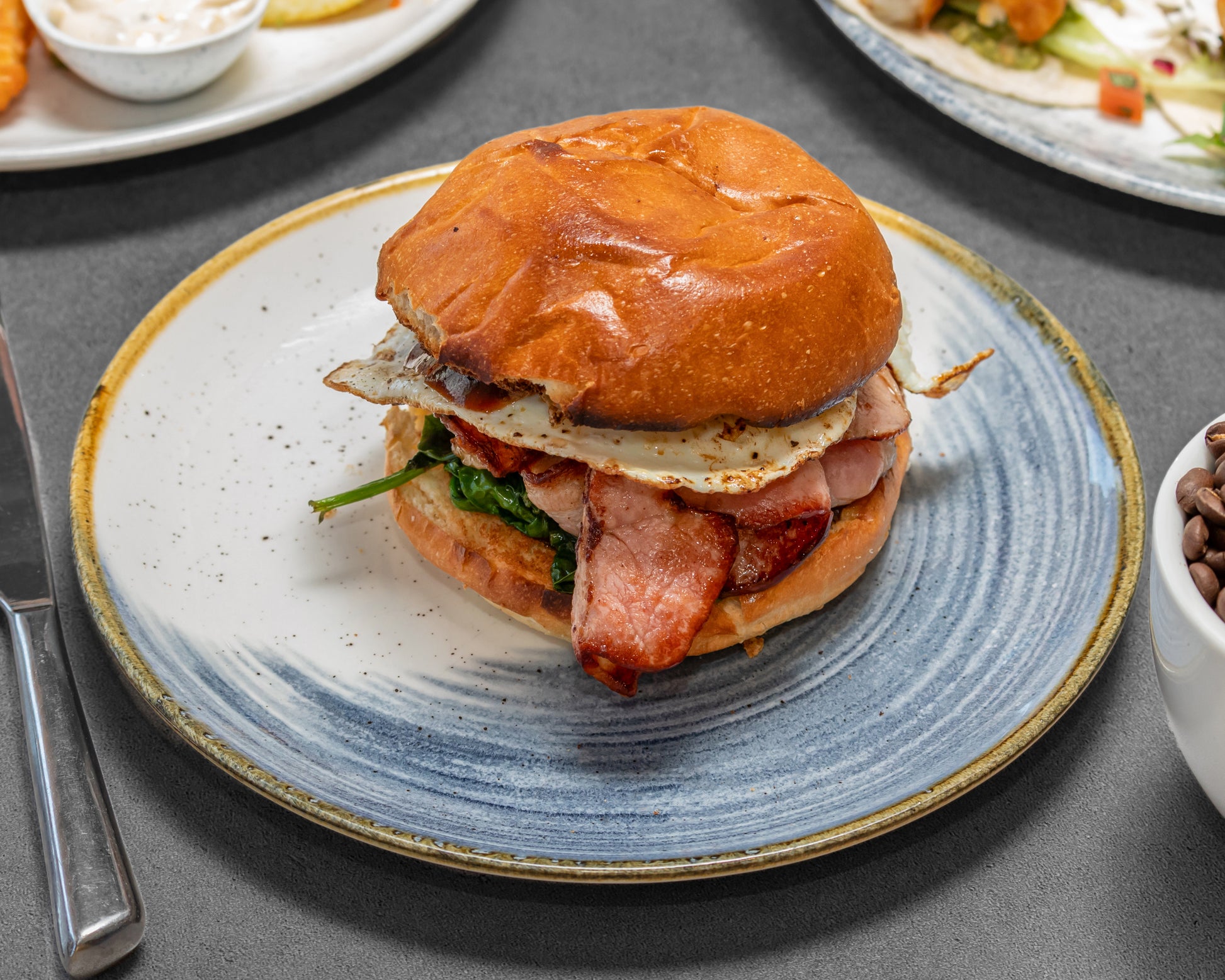 Soft milk bun loaded with crispy bacon, fried egg, seasoned greens, and sauce of your choice. Pure breakfast bliss.